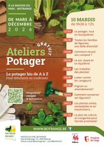 Notez donc ces dates à votre agenda dès maintenant : • 17 mars: le potager, tout un écosystème! • 31 mars: toutes les familles de légumes, une belle diversité! • 14 avril: comment réussir son compost ? • 19 mai: Le sol, vivant et en équilibre! • 16 juin: les maladies des plantes! • 15 septembre: lutter contre les ravageurs! • 13 octobre: engrais ou amendements? • 10 novembre: comment conserver ses légumes? • 24 novembre: Les plantes amies, comestibles et en macérations… • 1 décembre: Le plan de culture, on s’organise pour l’année prochaine!